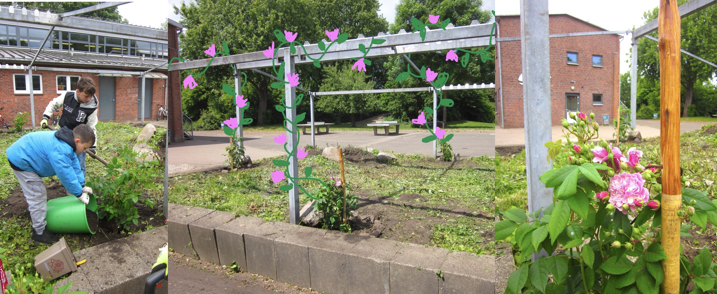 Die Vogelvoliere auf dem Schulhof ist Geschichte. Stattdessen wird sie nun von vier Seiten her umrankt von herrlich duftenden Rosen. Herzlichen Dank der Rosenschule Kordes, die uns bei diesem Projekt unterstützt hat. Die Kinder der 3b sorgen währenddessen dafür, dass alles wächst und gedeiht. Wir hoffen, dass die Rosen uns im kommenden Jahr über die Köpfe klettern.