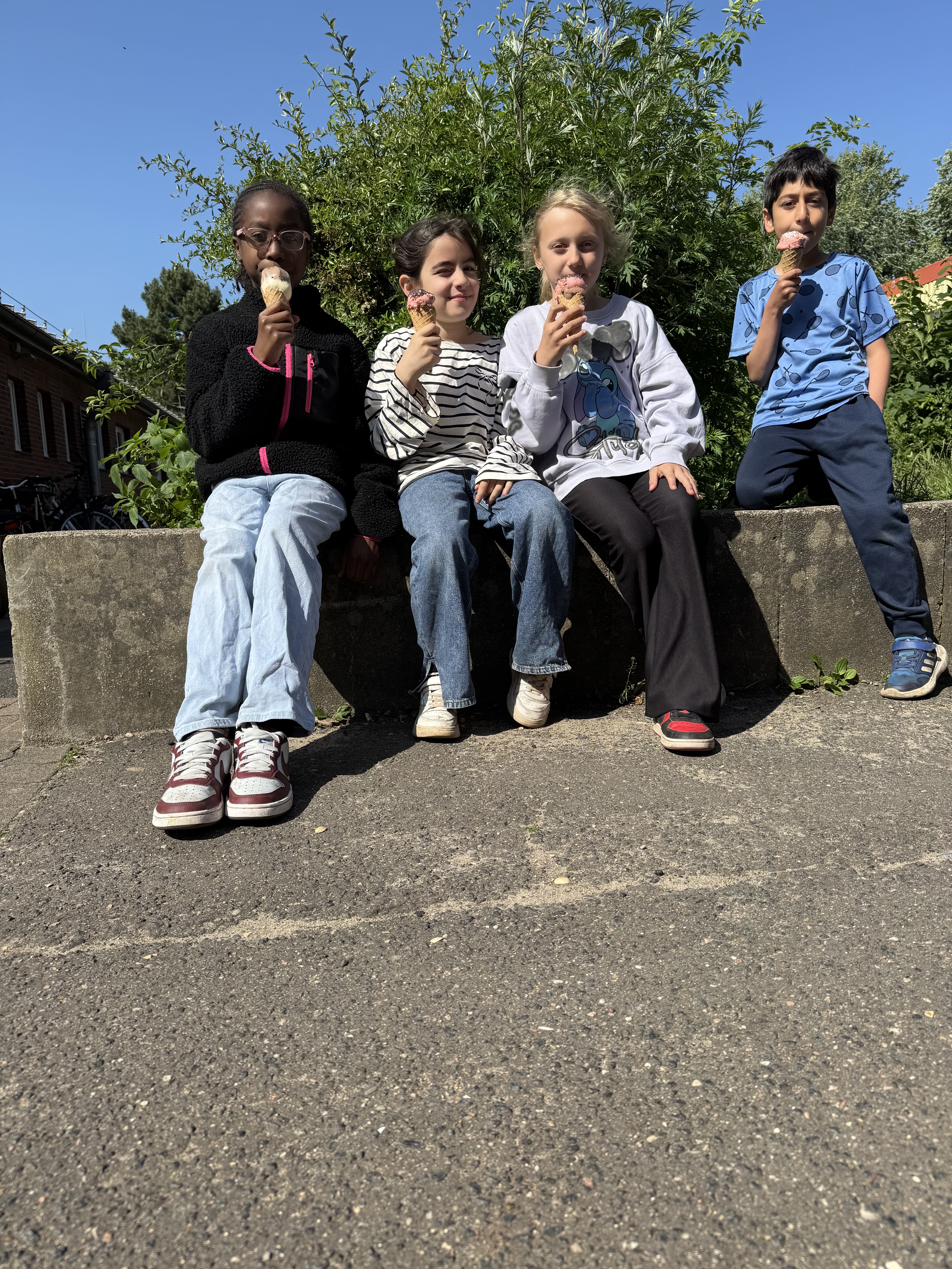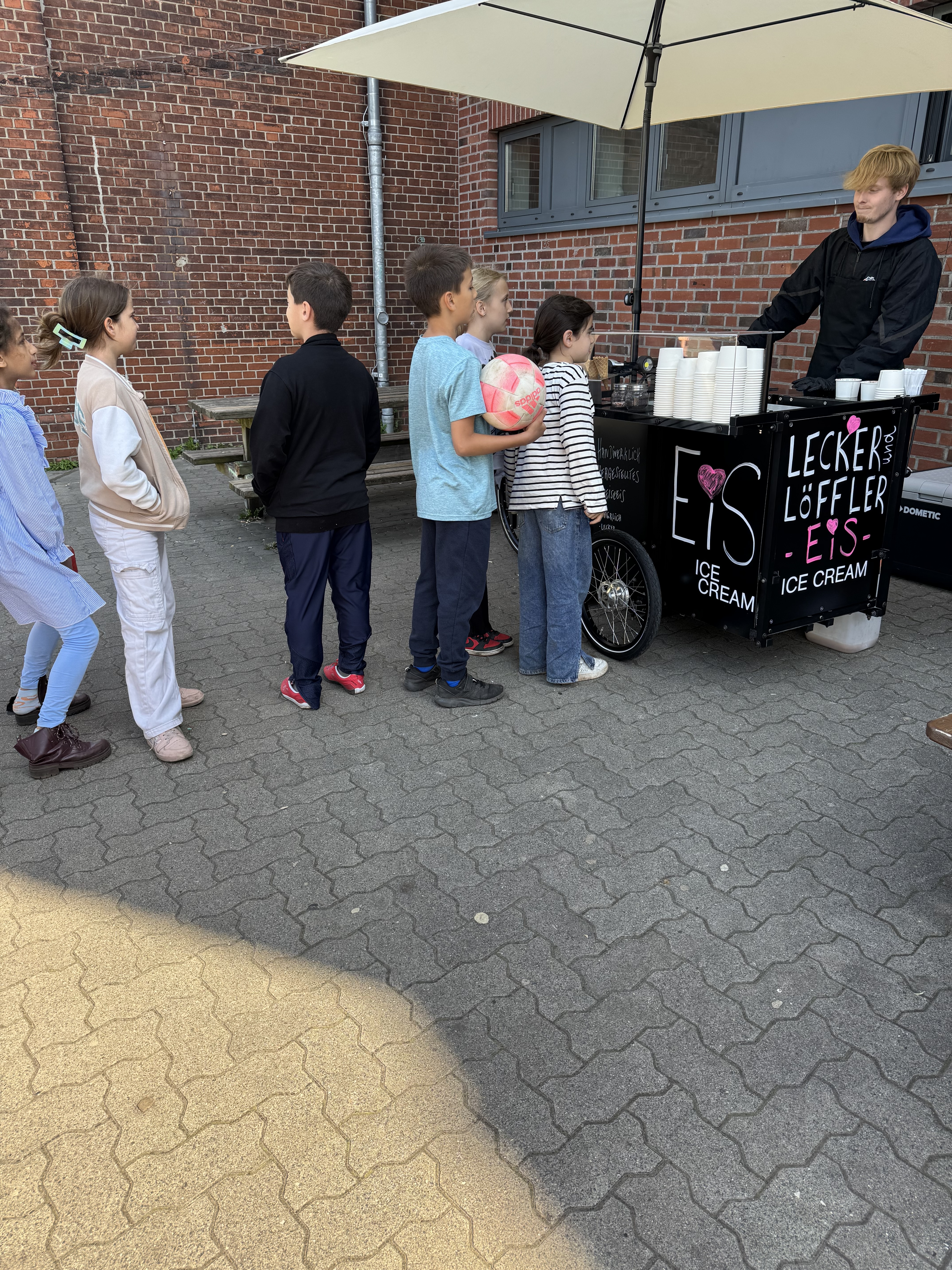 Zum Ende der Woche gab es für Groß und Klein an der Grundschule Hafenstraße leckeres Eis. Durch ein nachhaltiges Gebäudemanagement konnte die Schule Energiekosten einsparen und Geld gewinnen. Unser Hausmeister war dafür, dass dieser Gewinn den Kindern zugutekommt und engagierte Löffler’s Eiswagen.